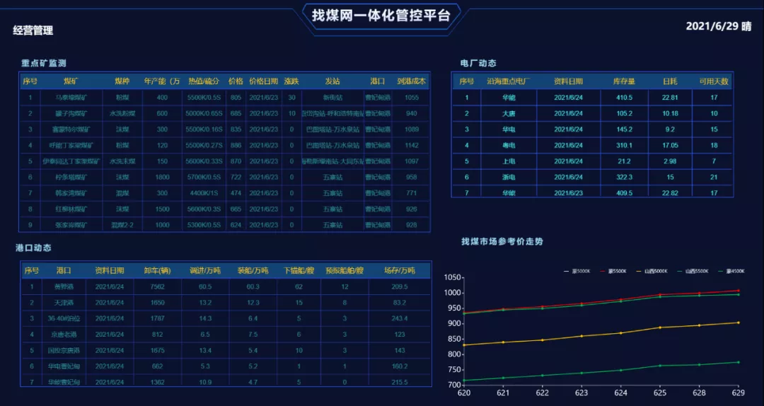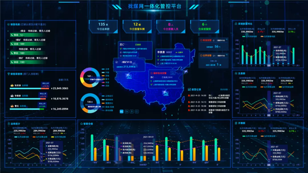 找煤网物联网综合管控平台构建综合集控中心,实现企业内外部系统信息共享,所有数据智能联动,自动整理、自动生成,使企业数据集成化,消除信息孤岛,令数据不再分散,省时省力,提高业务效率!