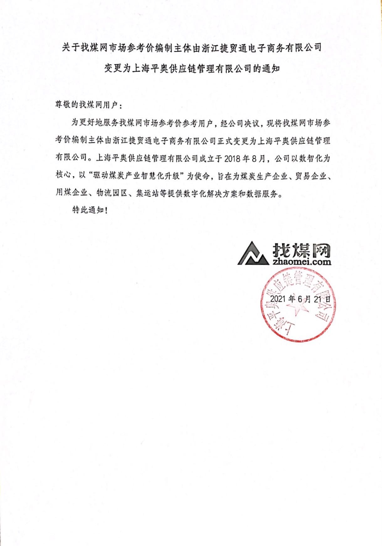 关于找煤网市场参考价编制主体由浙江捷贸通电子商务有限公司 变更为上海平奥供应链管理有限公司的通知
