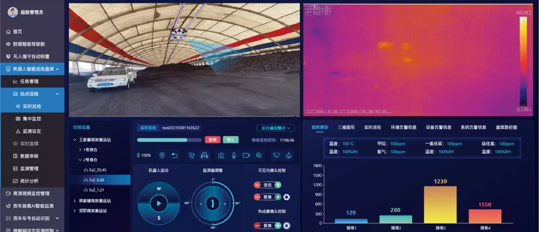 巡检任务管理、煤堆体积测量、煤温监测、环境监测、智能报警、人员跟踪、安全帽/工作服/异物等监测、机器人自动充电、自动清洁