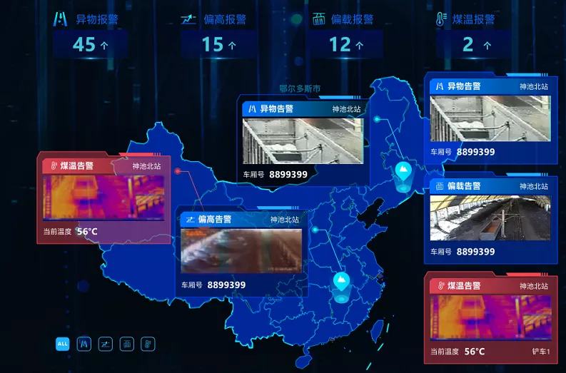 对煤温、异物、车辆偏载等进行监测,发现问题实时告警,并以图片和文字的形式展现在大屏中,方便管理人员及时发现并处理。