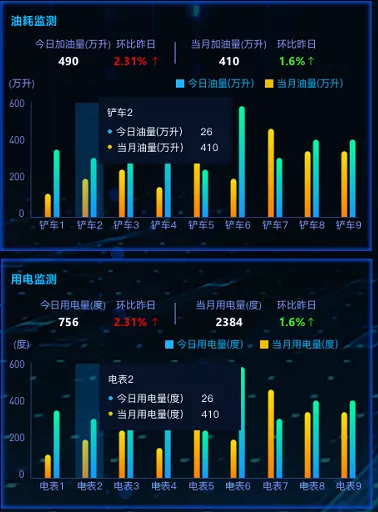企业油耗、用电实时监测,数据自动生成变动,统计图清晰易阅: