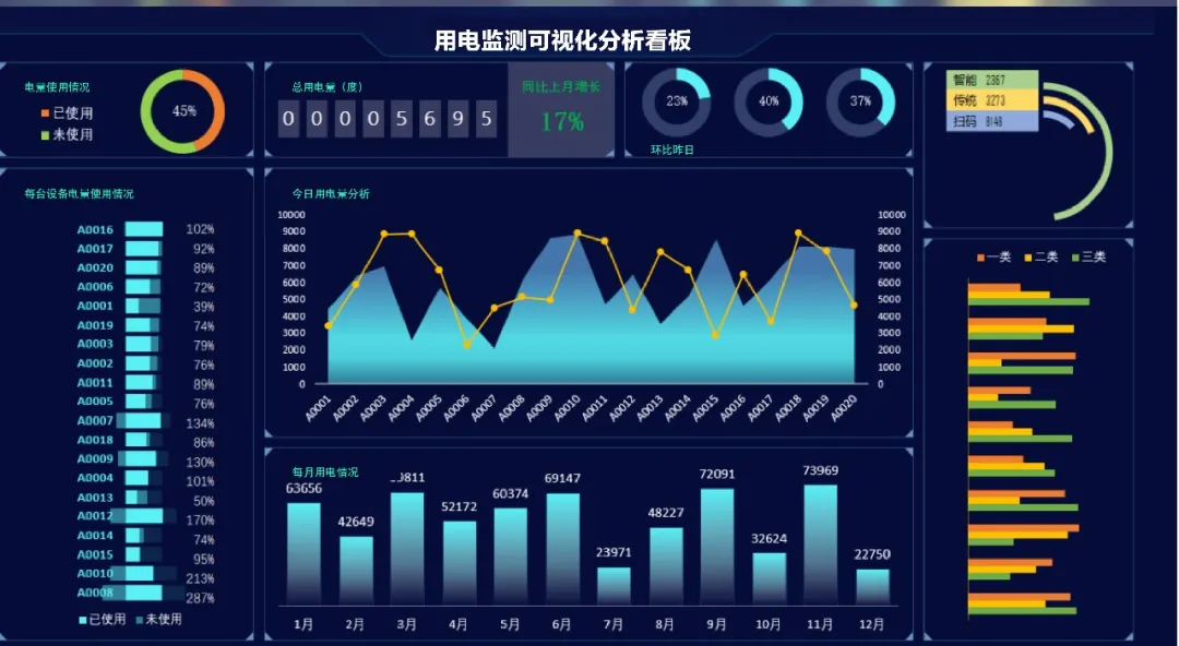 ░ 用电监测。监控和管理设备用电,自动收集、分析用电数据与异常,便于预估日后能耗,做到节能减排;