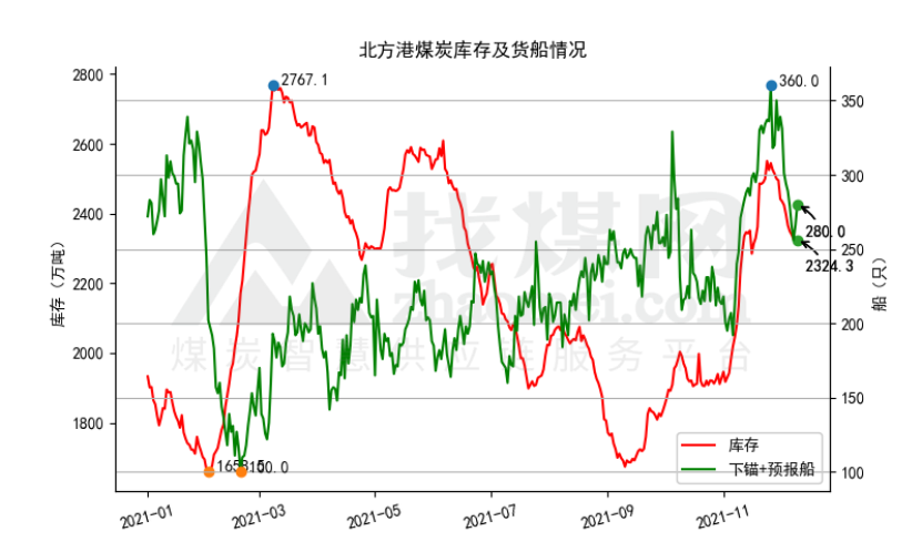 港口库存下降。12月9日,北方港调进212.7万吨(-8.7),装船217.4万吨(-6.5),库存2324.3万吨(-2),下锚船及预报船280艘(+14)。