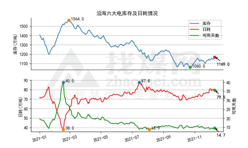 日耗、库存变化不大。12月9日,沿海六大电合计库存1169万吨(+6),日耗79.5万吨(-0.06),可用天数15天(+0.09)。