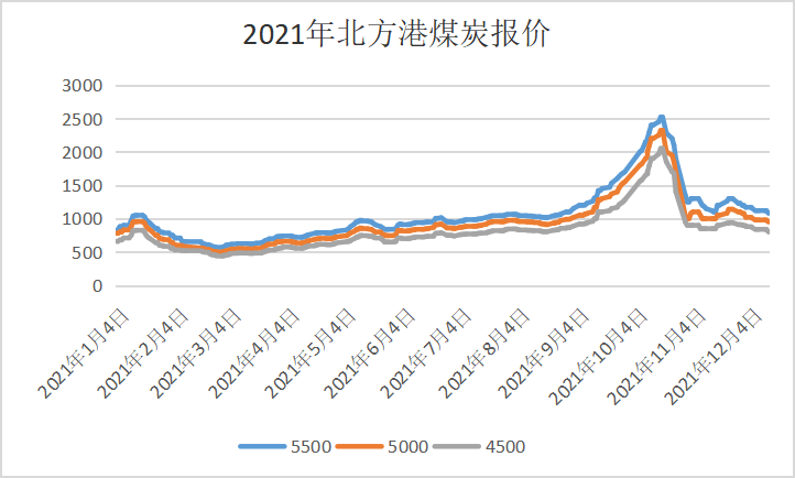 2021煤炭价格先涨后跌再涨,总体呈“⋀”字行情,大起大落巨幅波动。首月延续2020年末走势持续冲高,中旬每吨一度突破千元;而后受春节假日影响,煤炭需求阶段性回落,煤炭价格随之下降,2月底降至571元/吨左右,近乎腰斩;进入3月再度调头向上至970元/吨。煤炭价格中枢持续上移,难以回落,火电企业成本高企或成常态。随后在政策干预下下滑至840元/吨后继续上移。进入7月16日后再度调头向上至2018年以来最高的煤价2520元/吨。煤炭价格中枢持续上移,火电企业成本居高。进入11月通过保供煤和政策双重打击下,煤价出现断崖式下跌,截止发稿1060元/吨。