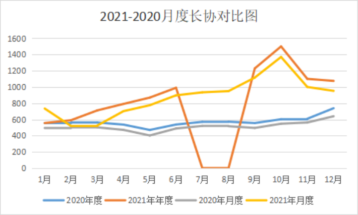 2020年5500的月度长协均价为572元/吨;2021年5500的月度长协均价为941元/吨,上涨369元/吨;2020年5000的月度长协均价为512元/吨;2021年5000的月度长协均价为873元/吨,上涨361元/吨。